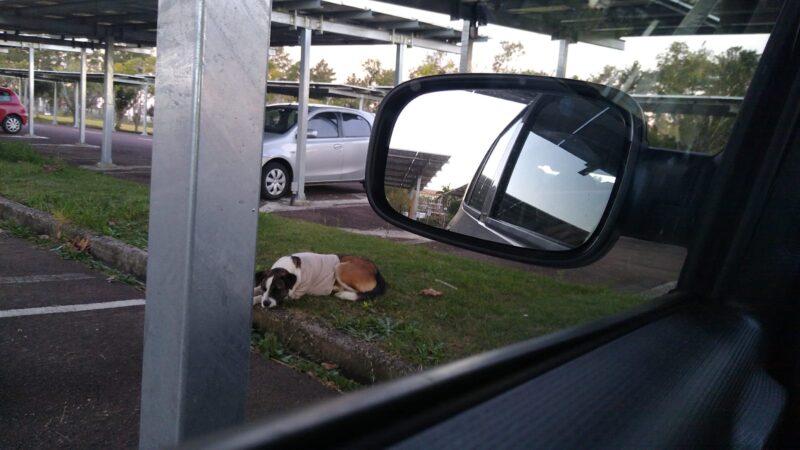 A Polly, nome que recebeu em homenagem ao campus em que foi abandonada, está na UFPR em maio de 2021 com cerca de seis meses de idade. Depois do primeiro lar temporário para realizar o procedimento de castração, ela tem transitado entre o campus e outros lares temporários.