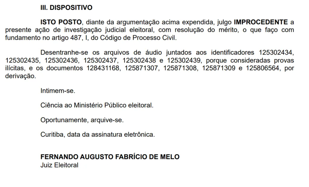 Paraná - O juiz eleitoral, Fernando Augusto Fabrício de Melo, descartou apontamentos apresentados pelo Ministério Público Eleitoral do Paraná contra o prefeito de Curitiba, Eduardo Pimentel (PSD) e o vice, Paulo Martins (PL) . O MPE-PR tinha pedido à Justiça a cassação do mandato dos políticos.