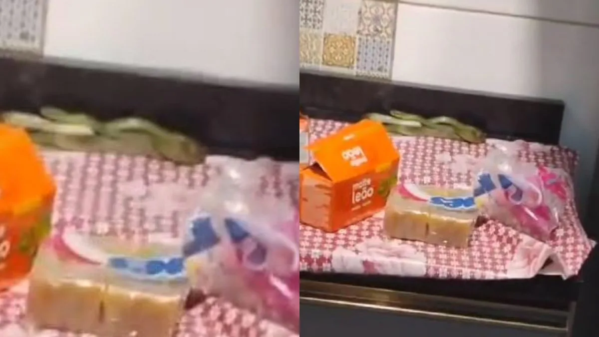 “Amor, será que é perigosa? Tireo o micro-ondas, no que eu tirei o micro-ondas ela deu uma pulada”, diz a mulher no vídeo. As imagens foram compartilhadas no Instagram do Felippe Repórter Selvagem.