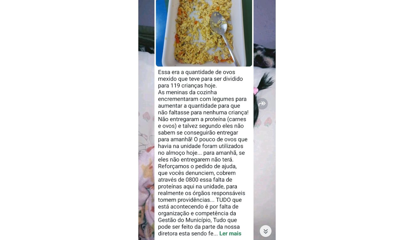 Segundo uma professora da unidade, devido à ausência de carnes e outras proteínas, foi servido apenas uma dúzia de ovos para todas as crianças matriculadas. Isso resultou em porções mínimas e impossibilidade de repetir.
