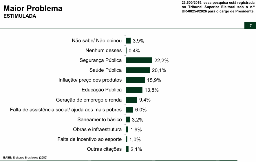 Um levantamento do Instituto Paraná Pesquisas apontou, nesta segunda-feira (02), a Segurança Pública como o maior problema do país, segundo percepção dos brasileiros. A pesquisa ouviu 2.080 eleitores, em 160 municípios dos 26 estados brasileiros e do Distrito Federal.