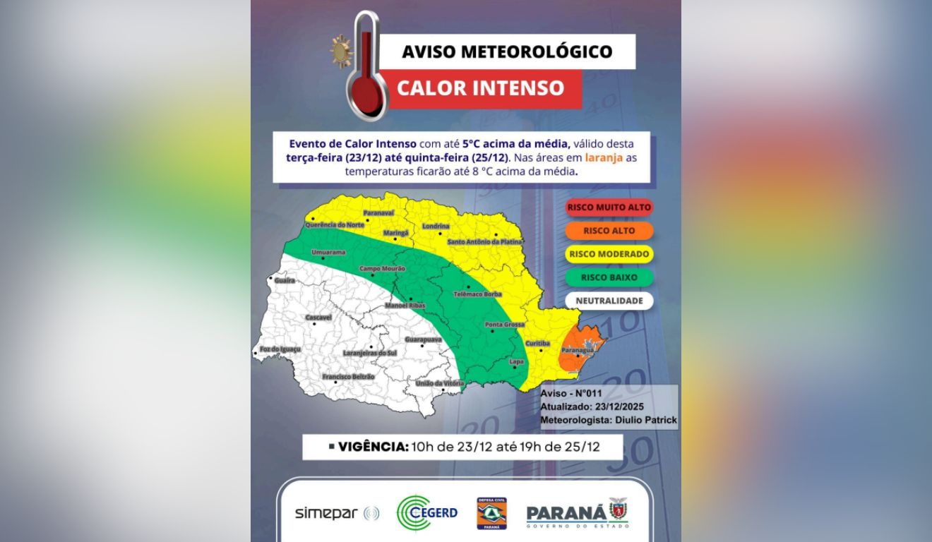 Além da instabilidade, o Paraná enfrenta um período de calor intenso. As temperaturas devem permanecer acima da média pelo menos até quinta-feira (25), especialmente nas regiões Norte, Região Metropolitana de Curitiba (RMC) e Litoral.