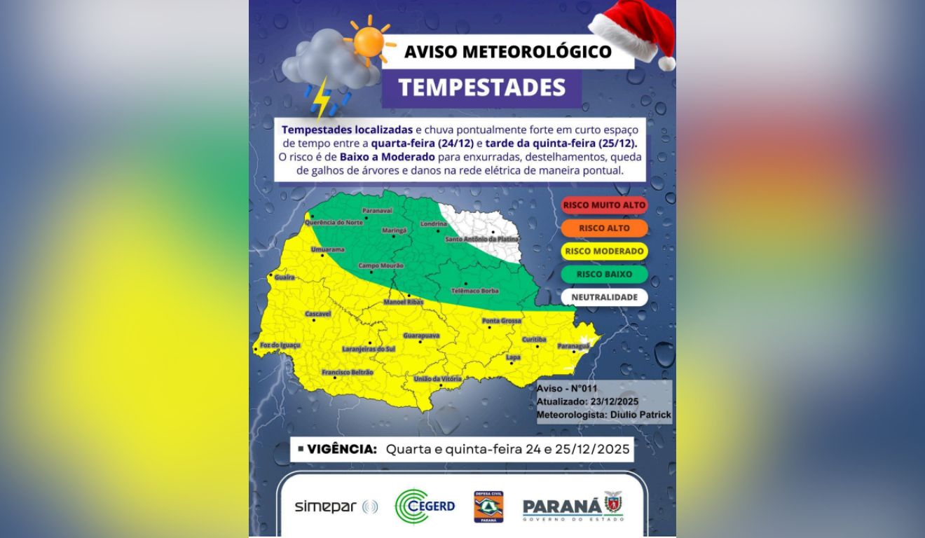 O tempo deve permanecer instável, com previsão de pancadas de chuva fortes em curto período de tempo, especialmente de forma pontual, ao longo desta quarta-feira (24). A instabilidade tende a se intensificar e atingir mais áreas do estado a partir da tarde de quinta-feira (25), feriado de Natal.