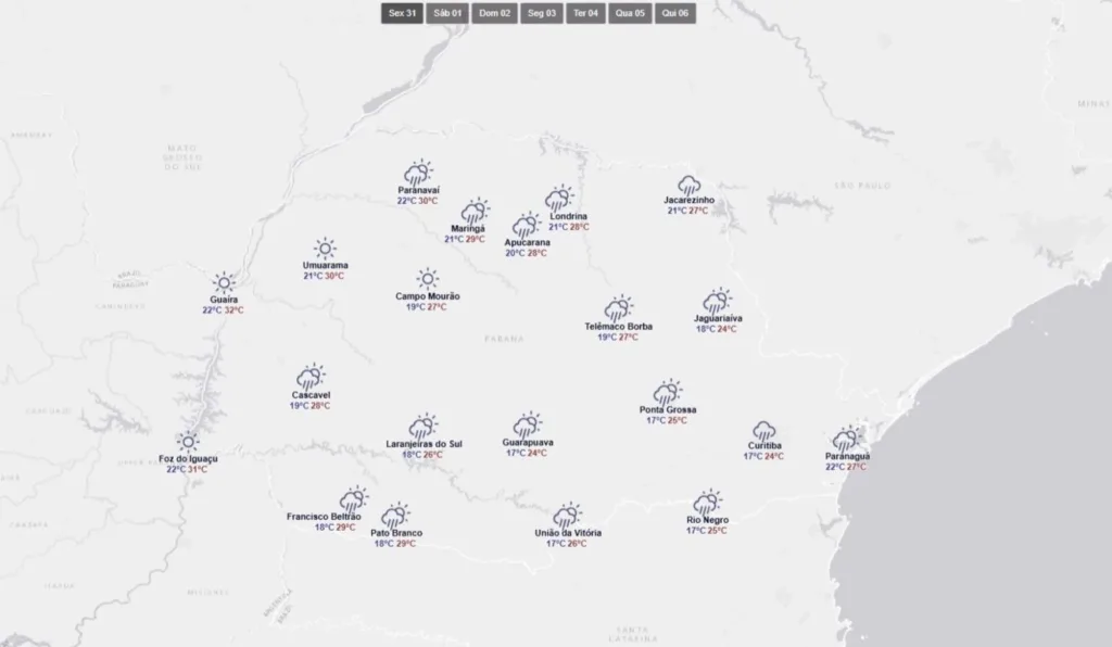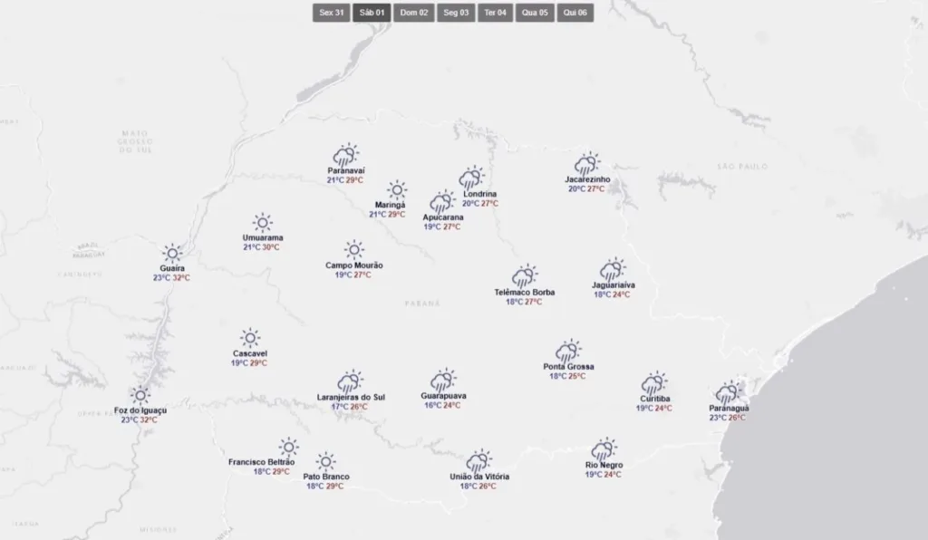 De acordo com o Simepar, no sábado (1º), a presença do sistema alongado de baixa pressão sobre o oceano Atlântico, na altura do litoral do estado, favorecerá a permanência da maior concentração de nebulosidade e a ocorrência de chuva em momentos do dia entre a RMC e o litoral, Campos Gerais e no setor norte do estado.