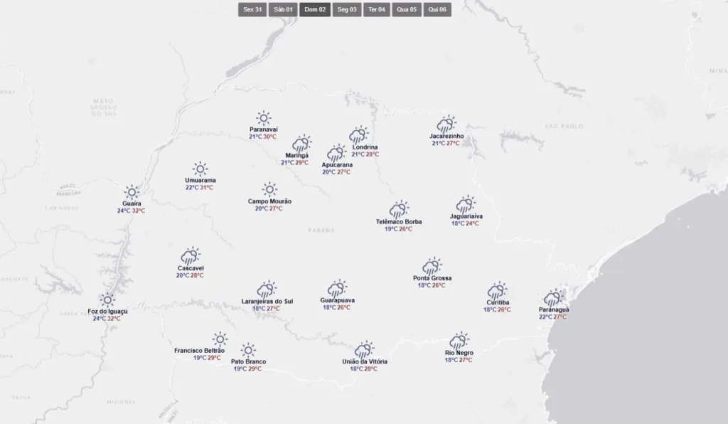 Ainda conforme o Simepar, em Curitiba a temperatura mínima é de 19°C. No domingo não devem ocorrer grandes mudanças no tempo, ainda há previsão de pancadas isoladas de chuva acompanhadas de trovoadas em todo o Paraná.