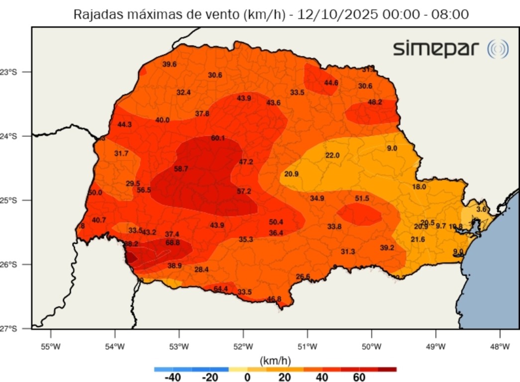 De acordo com o Sistema de Tecnologia e Monitoramento Ambiental do Paraná (Simepar), o município de Planalto registrou um vendaval de 88,2 quilômetros por hora entre às 0h e 1h. O número foi registrado pela estação meteorológica do Instituto Nacional de Meteorologia (Inmet).