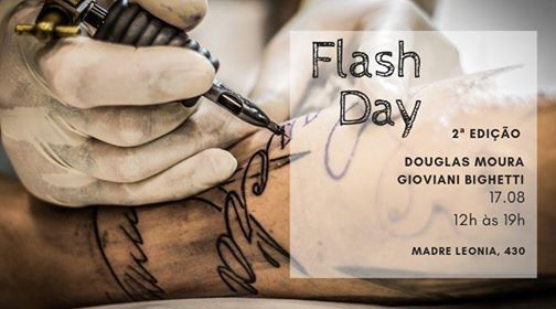 O Flash Day é um evento criado para as pessoas que querem fazer alguma tatuagem mas estão com a grana curta. Então, é liberado qualquer tatuagem de 5 a 8 cm com traços finos por um preço bem abaixo do normal. Esta segunda edição trará os tatuadores Douglas Moura e Giovani Bighetti no dia 17 de agosto das 12h Às 19h. Será por ordem de chegada!