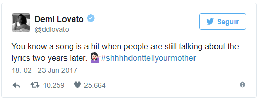 Demi então usou seu twitter para dizer ‘você sabe que sua música é um hit quando as pessoas ainda estão falando da letra dois anos depois’.