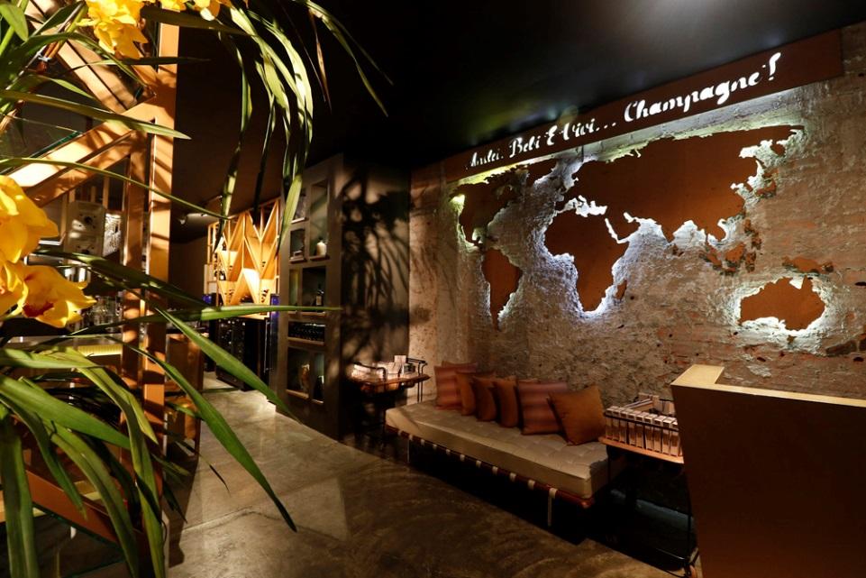Na fachada da La Champagneria, as luzes remetem às borbulhas do Champagne e significam a palavra “Amor” escrita em Braille. No interior da casa, destaca-se ainda o Mapa Mundi em cortiça, todo iluminado por trás que parece flutuar em uma parede de tijolos demolidos, local onde os clientes podem marcar com tachinhas lugares especiais do mundo em que estiveram bebendo.