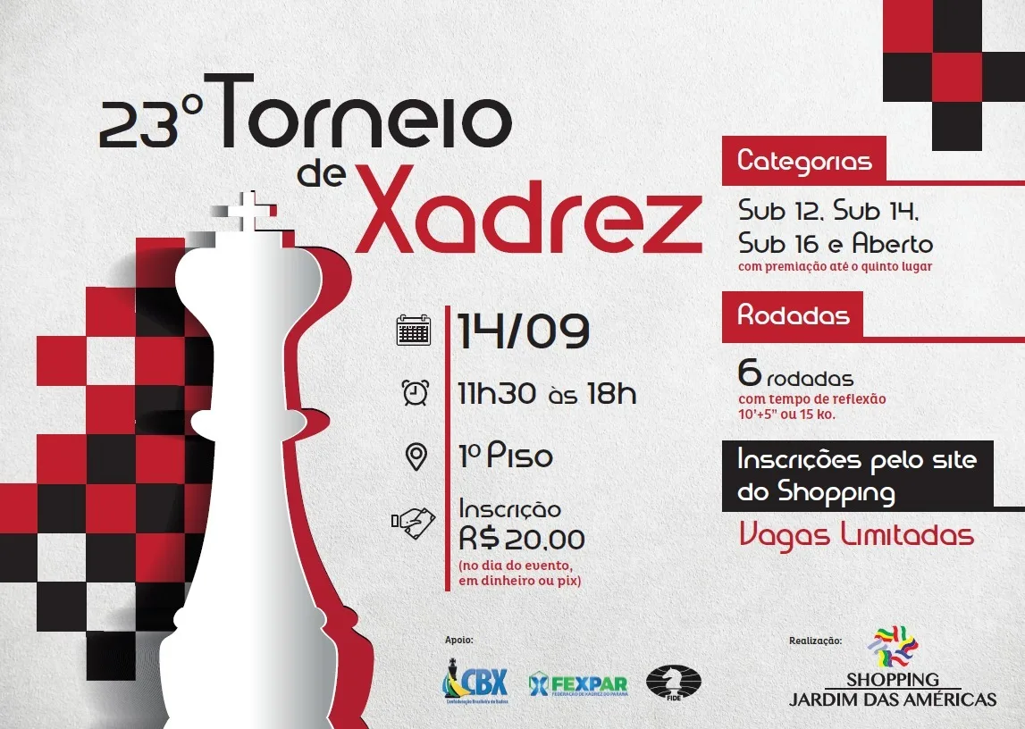 Os amantes do xadrez têm um compromisso marcado neste sábado (14) no Shopping Jardim das Américas, em Curitiba. Das 11h30 às 18h, o 1º piso do shopping será o cenário do 23º Torneio de Xadrez, reunindo jogadores de várias idades e níveis de habilidade para uma competição estratégica e intensa.