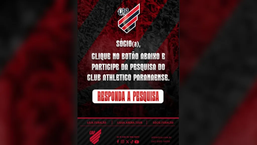 Curitiba - Os sócios-torcedores do Athletico receberam um e-mail nos últimos dias com um questionário com perguntas relacionadas à gestão do clube e também a Sociedade Anônima de Futebol (SAF).