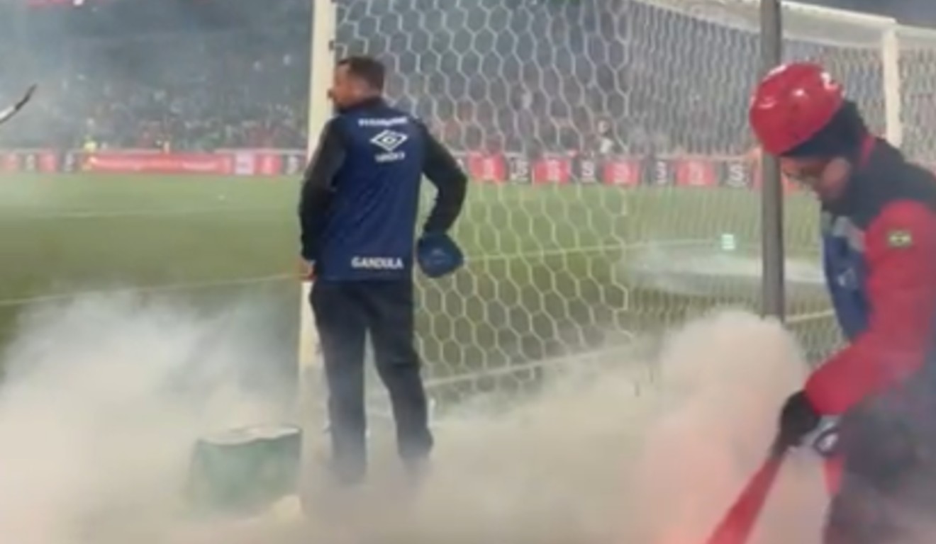 O repórter Lucca Marreiros, da Jovem Pan News, registrou o momento em que os bombeiros e equipe de segurança do jogo entraram em ação. Além dos sinalizadores, outros objetos, principalmente copos, também foram atirados no gramado. Veja abaixo
