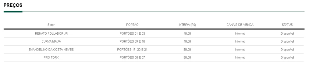 Para os setores Renato Follador Jr e Curva Mauá, o valor do ingresso é de R$ 40 a inteira, e R$ 20 a meia entrada. Já no setor Evangelino da Costa Neves (social) e Pro Tork, o ingresso custa R$ 80, com a meia sendo R$ 40.