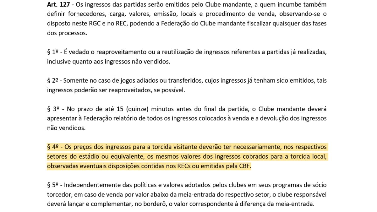 De acordo com o Regulamento Geral das Competições da CBF, os valores dos ingressos destinados à torcida visitante devem ser equivalentes aos praticados para os torcedores do clube mandante em setores equivalentes do estádio. O artigo 127, parágrafo 4º, reforça que é obrigatório manter a paridade de preços entre os setores destinados às duas torcidas.