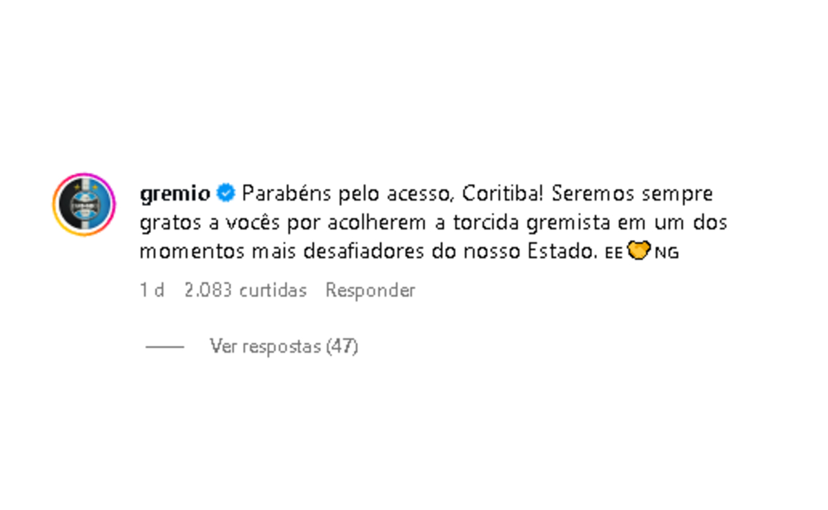 “Parabéns pelo acesso, Coritiba! Seremos sempre gratos a vocês por acolherem a torcida gremista em um dos momentos mais desafiadores do nosso Estado”, escreveu o Grêmio no post publicado nas redes sociais do Coritiba