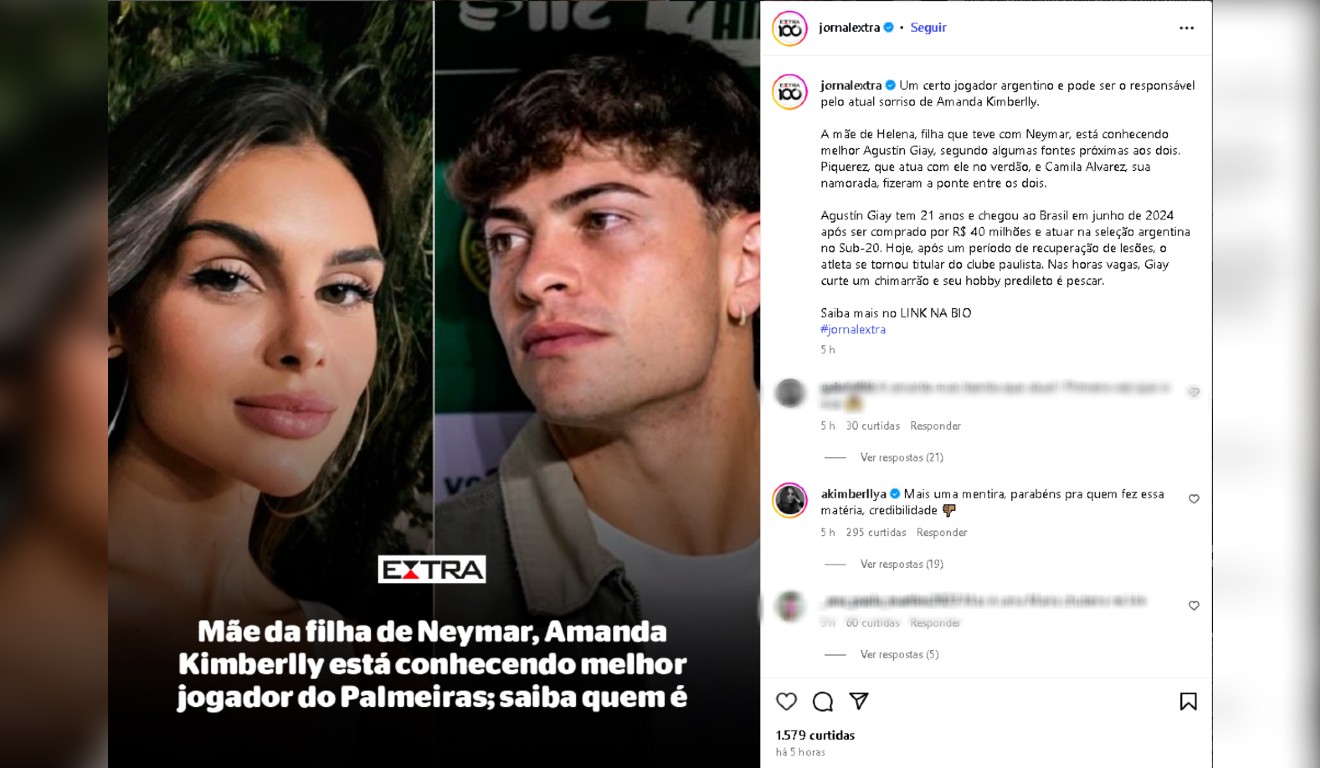 “Mais uma mentira, parabéns para quem fez essa matéria, credibilidade 👎”, escreveu ela. De acordo com o Extra, Amanda Kimberlly e Agustín Giay foram apresentados por amigos em comum e estariam se aproximando.