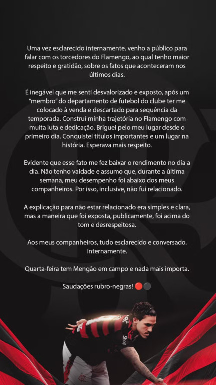 “É inegável que me senti desvalorizado e exposto, após um “membro” do departamento de futebol do clube ter me colocado à venda e descartado para sequência da temporada“, acrescenta Pedro. A refererência do jogador é uma notícia dada pelo jornalista Mauro Cezar Pereira, apurada com um dirigente do clube, que o Flamengo estaria disposto a negociar o atacante por 15 milhões de euros ( cerca de R$ 97 milhões).