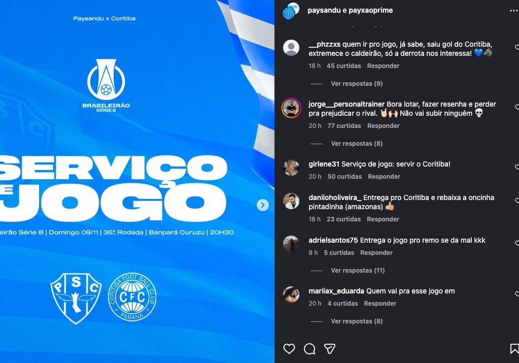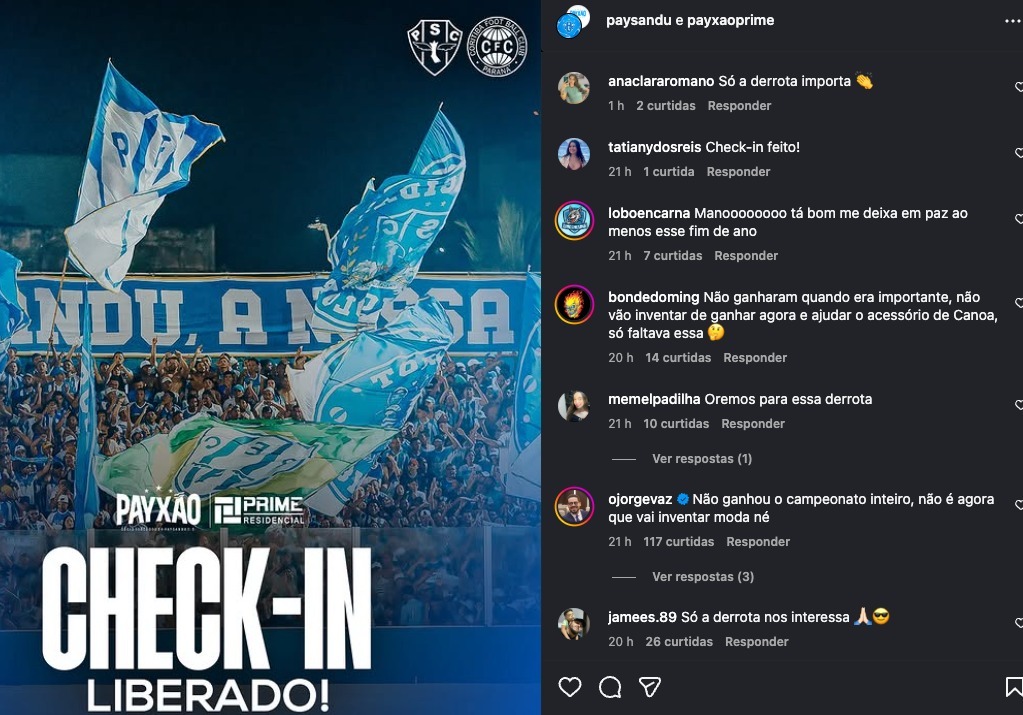 Com os checkins liberados para o jogo, nos comentários de um post do Papão da Curuzu nas redes sociais, é possível ver os torcedores pedindo por uma derrota. “Essa vai ser a derrota mais comemorada de todas. Paysandu tem que fazer quatro gols contra, vamos entrega essa parada, pelo amor de Deus“, escreveu uma torcedora.
