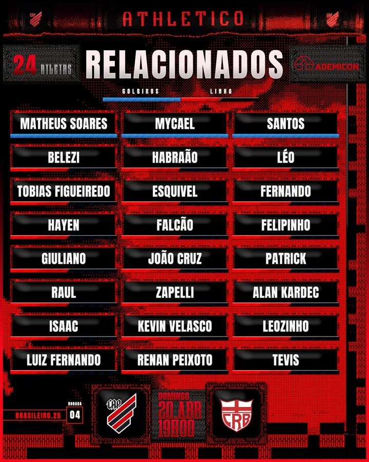 Sendo assim, o Furacão deve entrar em campo com Mycael; Palacios, Habraão, Léo e Fernando (Esquivel); Felipinho, Raul e Zapelli; Luiz Fernando, Velasco e Alan Kardec. Técnico: Maurício Barbieri.