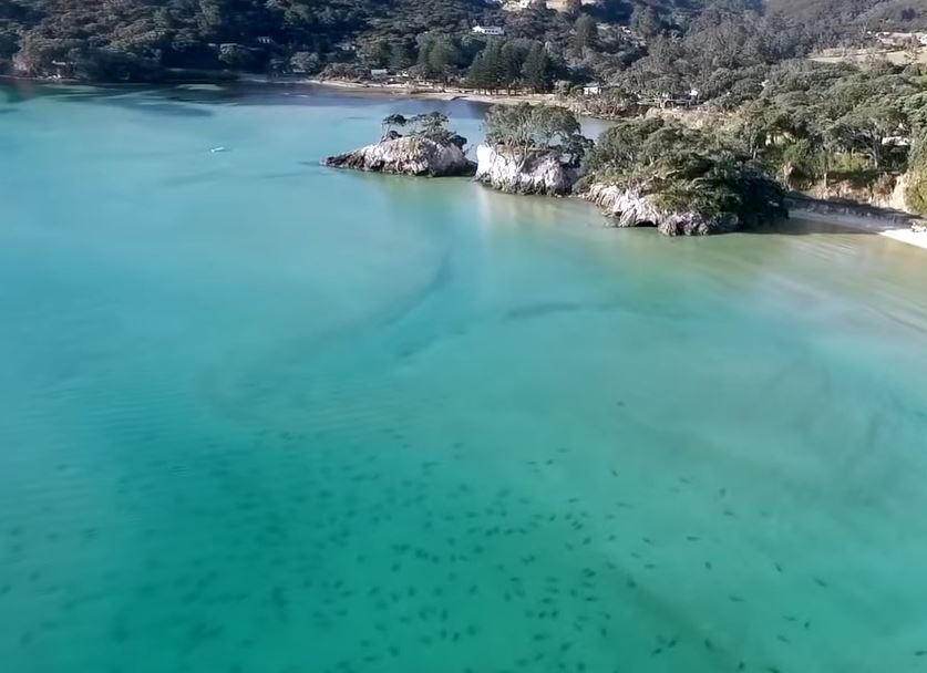 O avistamento de tubarões em massa foi registrado por um jovem mergulhador na Ilha Great Barrier, no golfo de Hauraki, a 90 quilômetros da costa de Auckland no início de janeiro deste ano.
