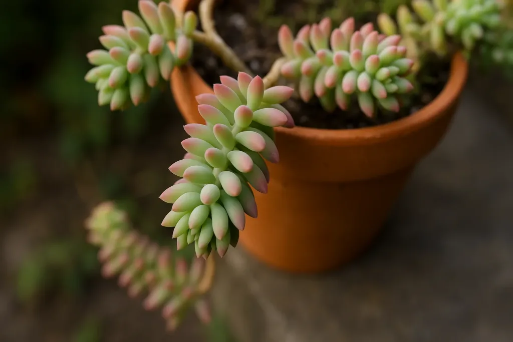 A dedinho-de-moça, cujo nome científico é Sedum morganianum, é nativa do México, especialmente de regiões montanhosas com clima semiárido. Isso explica sua incrível capacidade de armazenar água nas folhas e resistir bem à seca.