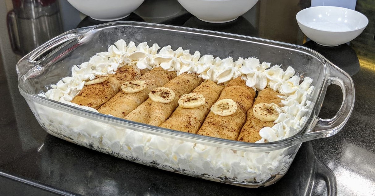 - Recheie as massas com doce de leite, banana e canela com açúcar;