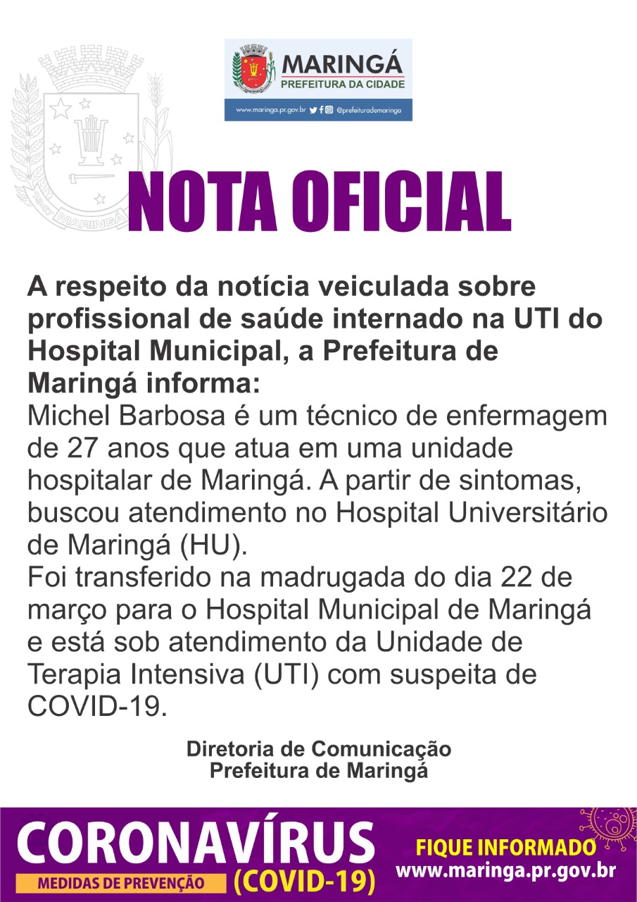 De acordo com a Prefeitura Municipal, o paciente trabalhou no último sábado (21) e começou a sentir os sintomas da doença no fim do expediente. Na sequência, ele buscou atendimento no Hospital Universitário Regional de Maringá e já na madrugada deste domingo (22) precisou ser transferido para o Hospital Municipal, onde permanece hospitalizado.