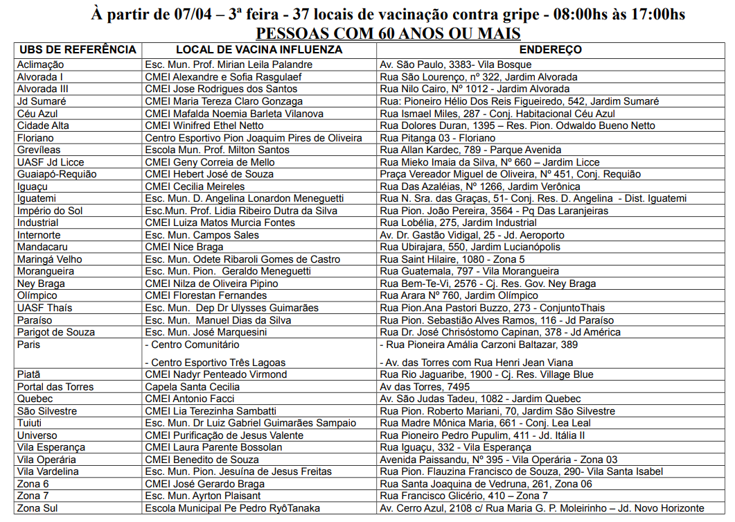 A Secretaria de Saúde de Maringá ampliou a faixa etária do grupo prioritário da vacinação contra a gripe, a partir desta terça-feira (7) idosos com mais de 60 anos também poderão receber a dose do antiviral. (Confira abaixo pontos de vacinação)
