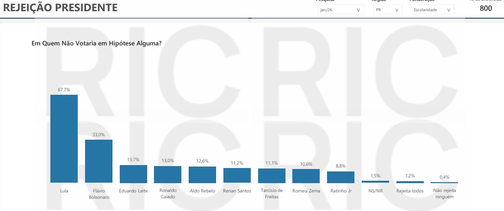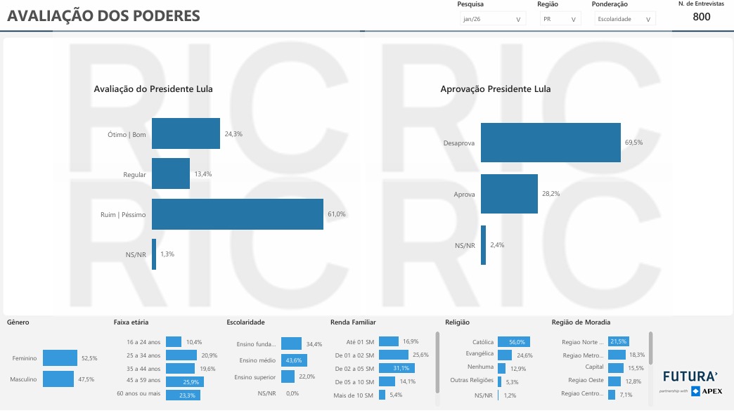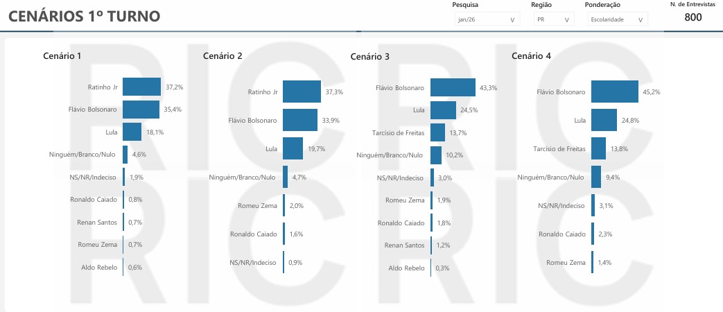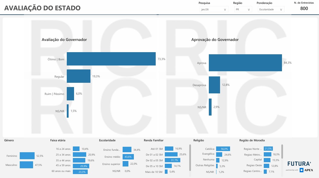 A Futura Inteligência, instituto de pesquisa da Apex Partners realizou 800 entrevistas telefônicas entre 24 e 27 de janeiro no Paraná. A sondagem tem margem de erro de 3,5 pontos e índice de confiança de 95%. O levantamento foi registrado junto ao TSE sob o número BR-04148/2026 |