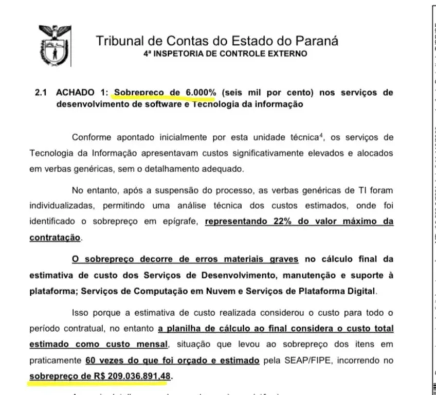 Um levantamento do Tribunal de Contas do Paraná (TCE-PR) apontou possível sobrepreço de 6000% e indícios do que seria um direcionamento de licitação.