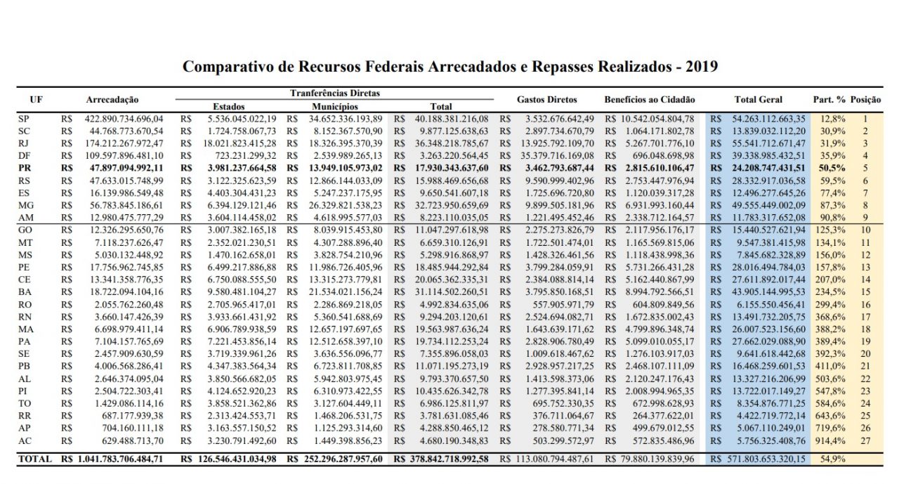 Os paranaenses pagaram em 2019 R$ 47,90 bilhões em tributos federais. Em troca, o estado recebeu apenas R$ 24,21 bi, ou seja 50,54%. O governo federal embolsou R$ 23 bi.
