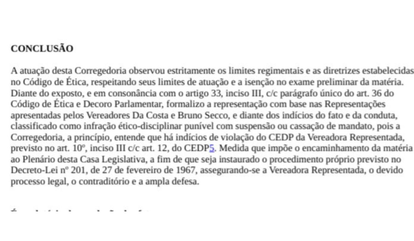 Se houver aceite a vereadora terá direito ao contraditório e ampla defesa. As penalidades possíveis, conforme o parecer, incluem suspensão ou cassação do mandato. A conclusão final deverá ser dos colegas da vereadora que após esses passos decidem sobre punição em nova votação no plenário.