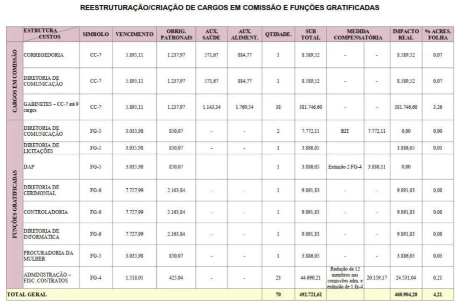 Os novos postos e funções que devem ser criados vão atender: a Corregedoria, a Controladoria, a Procuradoria da Mulher, a Administração e Fiscalização de Contratos e as diretorias de Comunicação, Licitações, Cerimonial, Informática, além dos gabinetes dos vereadores.