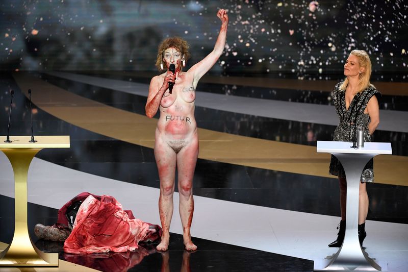 PARIS (Reuters) – A atriz francesa Corinne Masiero tirou a roupa no palco durante uma cerimônia reduzida do prêmio César, em Paris, para protestar contra o fechamento de cinemas e teatros pelo governo francês durante a pandemia de coronavírus.