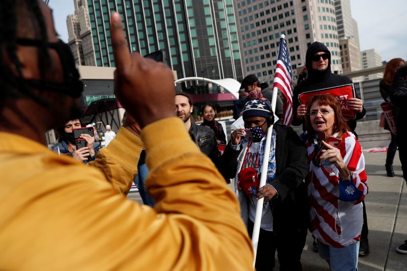 Embora a contagem já tenha terminado no Michigan, onde veículos de notícias projetaram uma vitória de Biden, algumas dúzias de apoiadores de Trump acenavam com bandeiras e cartazes diante de um centro de apuração em Detroit.