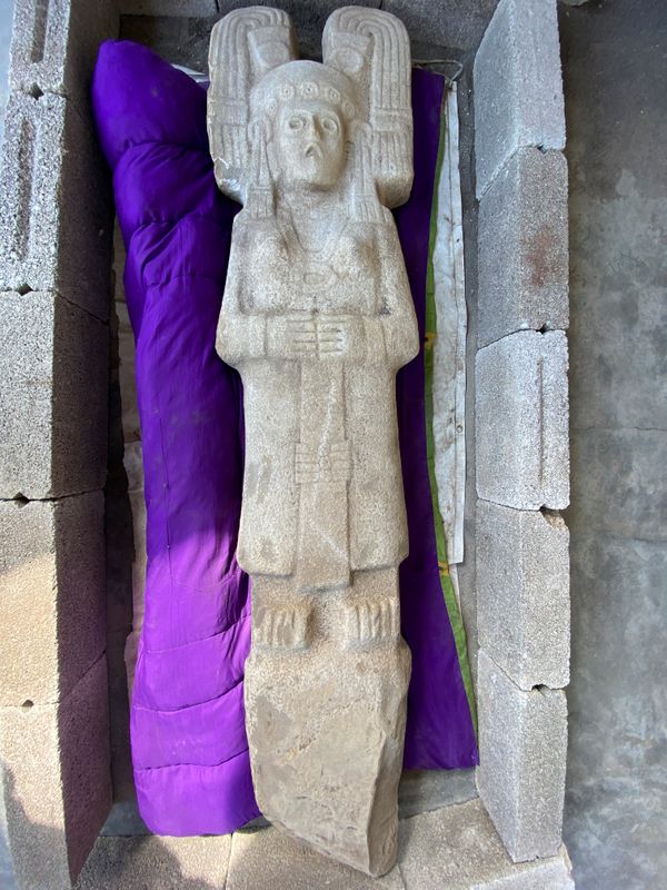 Os agricultores a transportaram cuidadosamente até um caminhão e a levaram à casa de Cabrera. Um pouco de investigação na internet nos dias seguintes persuadiram Cabrera de que a estátua, entalhada com ornamentos elaborados e um cocar de penas ondulantes, lembrava a deusa da luxúria dos huastecas.