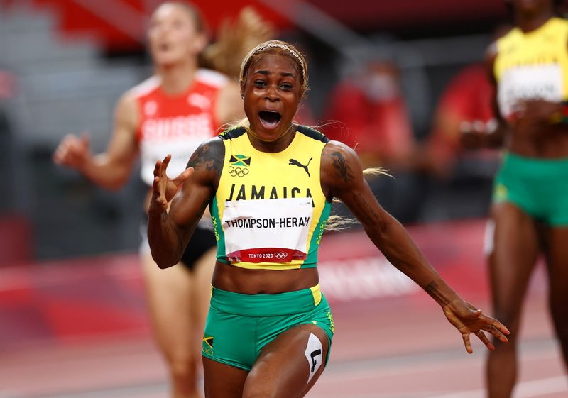 TÓQUIO (Reuters) – Elaine Thompson-Herah conquistou o bicampeonato olímpico dos 100 metros rasos e liderou o pódio inteiro da Jamaica na final da prova nos Jogos de Tóquio, neste sábado, marcando incríveis 10,61 segundos para se tornar a segunda mulher mais rápida da história.