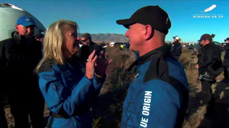 Bezos chegou com membros da equipe de recuperação da Blue Origin para saudar e abraçar os astronautas recém-formados à medida em que deixavam a cápsula sorridentes e vestidos com trajes na cor azul. Em meio a aplausos, Bezos entregou um broche com formato de asas a cada um dos tripulantes.