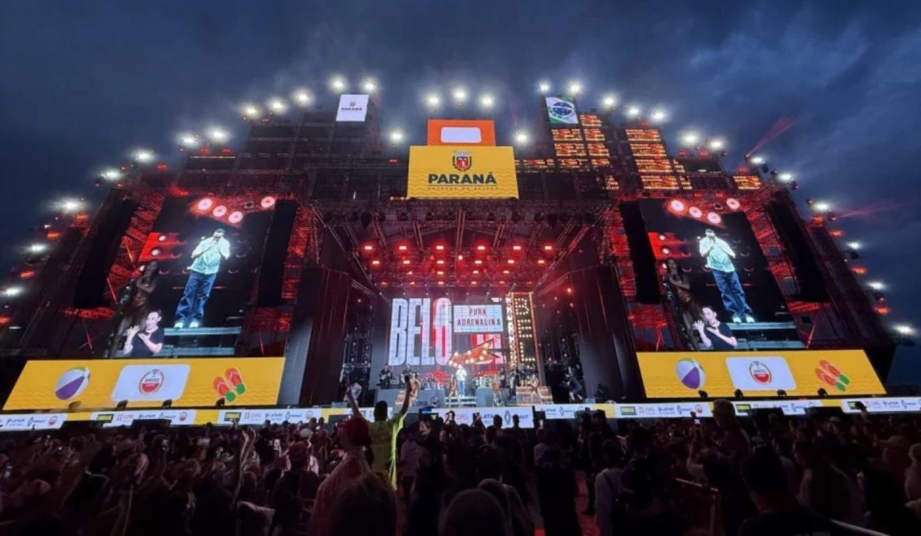 Quando Belo subiu ao palco, a arena ganhou novos contornos. Desde os primeiros acordes, o cantor foi recebido com aplausos e um coro que ecoava pela orla, evidenciando a relação construída ao longo de décadas com o público paranaense.
