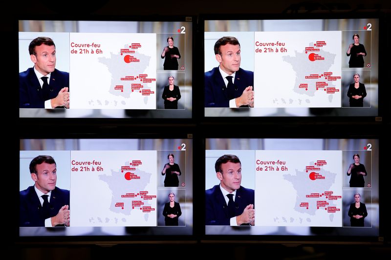PARIS (Reuters) – A França irá impor um toque de recolher noturno a quase um terço da população de 67 milhões de pessoas para combater um ressurgimento do coronavírus, embora um novo lockdown nacional não esteja previsto, disse o presidente Emmanuel Macron nesta quarta-feira.