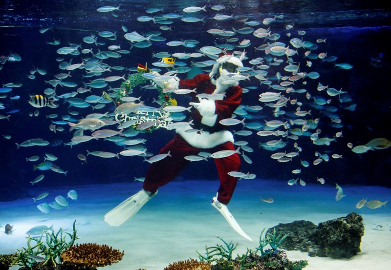 TÓQUIO (Reuters) – Vestida com uma fantasia de Papai Noel, máscara e pé de pato, uma mergulhadora acenava em meio a uma cortina de peixes tropicais em um aquário de Tóquio para espectadores que cumpriam distanciamento social por trás de um vidro.