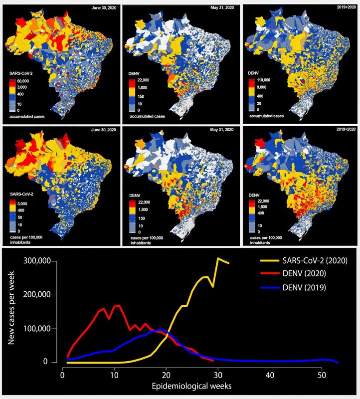 A resposta, segundo Nicolelis, apareceu ao analisar a distribuição geográfica dos casos de dengue no Brasil em 2019 e 2020, que ocupavam exatamente os buracos no mapa de casos da Covid-19. As curvas de casos das duas doenças reforçaram a descoberta, uma vez que o surto de dengue entrou em declive acentuado no país no mesmo momento da disparada do novo coronavírus.