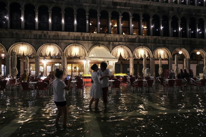 Mas o que ocorreu desta vez foi menos danoso, e casais presentes na praça dançaram ao som de música de piano com água quase até os joelhos, enquanto crianças jogavam água e batiam os braços e turistas atravessavam com os sapatos nas mãos.