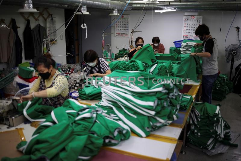 Uma confecção de 500 metros quadrados de Seongbuk, um distrito da capital Seul, estava a mil por hora nesta semana, e fios verdes oavam de carreteis de máquinas de costura em uma corrida para atender encomendas.