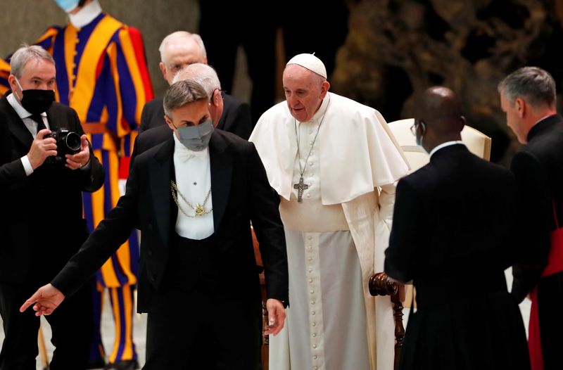 CIDADE DO VATICANO (Reuters) – O papa Francisco descreveu nesta quarta-feira a pandemia de Covid-19 como uma “senhora” capataz durona que deve ser obedecida, mas ele e seus assessores mais próximos não usaram máscaras em sua audiência geral.