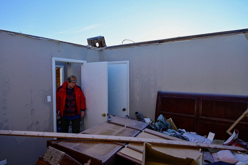 Timothy McDill, de 48 anos, um técnico de manutenção de refrigeradores, dormiu no sábado sem energia em sua casa, em Mayfield, que seus pais compraram em 1992. Um poste de telefones atravessou a janela e a parede de tijolos foi arrancada, deixando o interior exposto.
