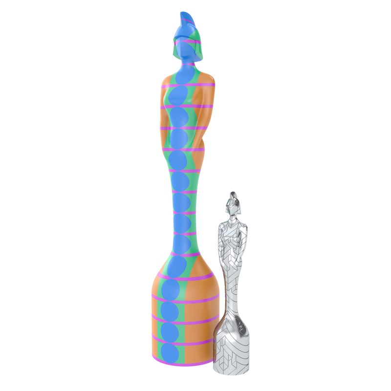 Os artistas Es Devlin e Yinka Ilori criaram as estatuetas, que serão entregues em pares na cerimônia de 11 de maio na arena O2 de Londres.