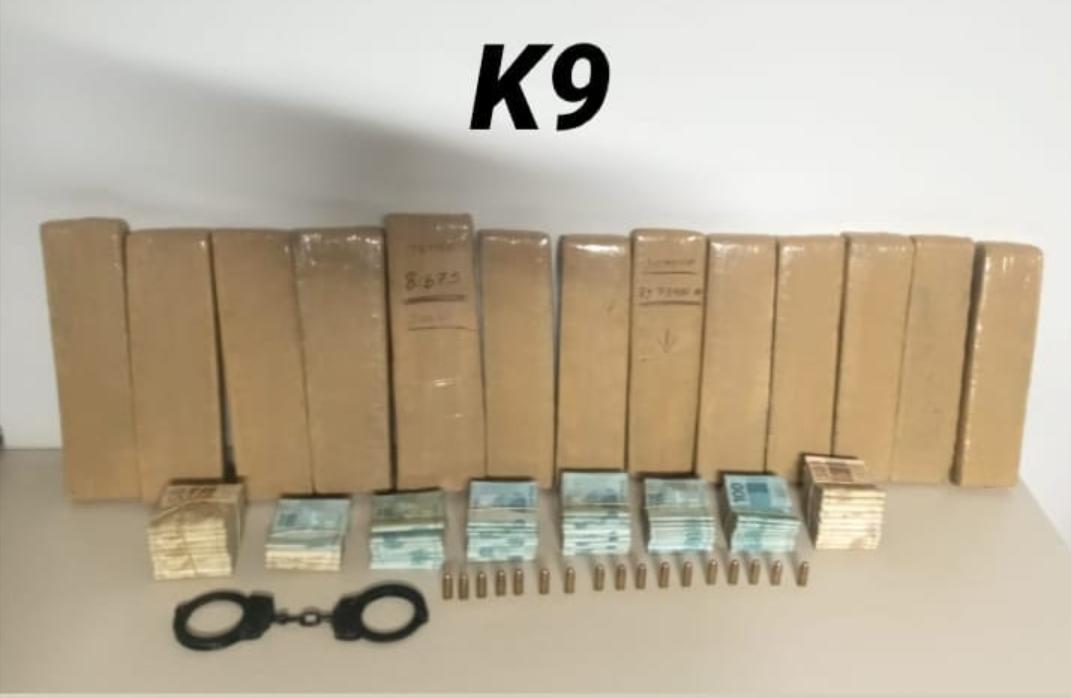 Na sequência, com apoio da equipe Choque K9, os policiais foram até a residência do detido onde com o emprego das K9 Gaia e K9 Athina foram encontrados mais 8,675 kg de maconha em um saco de ração e também R$ 73.900,00 em dinheiro.