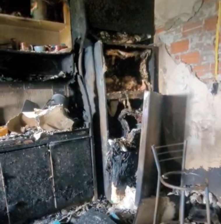 Na imagem, é possível ver o cenário de devastação deixado pelo incêndio: móveis e eletrodomésticos completamente carbonizados, paredes escurecidas e uma espessa camada de fuligem cobrindo o espaço.