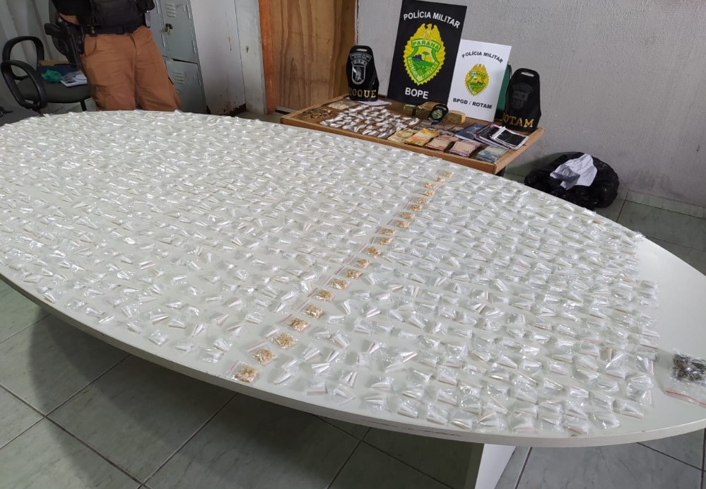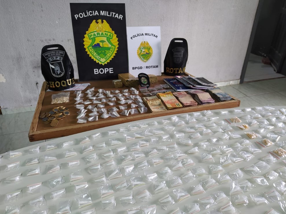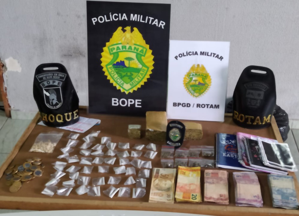 Foram apreendidos 600 pinos de cocaína, 600 pedras de crack, três mil reais em dinheiro trocado, meio quilo de maconha, anotações do tráfico de drogas. Duas pessoas foram presas e três crianças foram encaminhadas ao Conselho Tutelar.